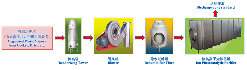 來自魚粉生產設備的大量有組織高溫廢汽經密閉管道收集后,先集中進入除臭塔,在經過除臭塔的途徑中,被大量的冷卻水充分噴淋后,大部分的高溫廢汽迅速降溫,馬上冷凝成水,與冷卻水混合后排放,同時廢汽中的微粒粉塵也得以洗滌。然后通過引風機的作用送入除水過濾器,去除掉剩余廢汽中的水汽部分,然后集中送入除臭離子光催化器,在離子燈管和紫外線燈管的雙重催化作用下,對廢氣中的臭氣分子進行分解,達到排放標準要求。