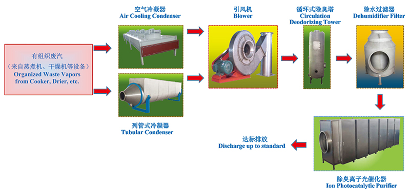 針對魚粉工廠的實際工作情況,我們將廢汽分為兩大類,即有組織廢汽和無組織廢氣。所謂有組織廢汽就是來自蒸煮機、干燥機等設備在生產過程中產生的大量水蒸氣,該廢汽的特點是溫度高達95C以上,且濃度相當高。無組織廢氣是指來自原料池、生產車間及倉庫的有味氣體,該氣體的特點是濃度較低,溫度也不高,但氣量相當大。根據客戶工廠的選址情況及具體條件,我們將有組織廢汽處理工藝分成兩種配套方案,以下是針對這兩種廢汽處理配套方案的工藝說明及流程方框圖。